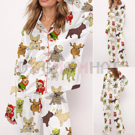 Christmas French Bulldog Satin Pajama Set For Women – Comfy Satin Sleepwear & Loungewear Pjs