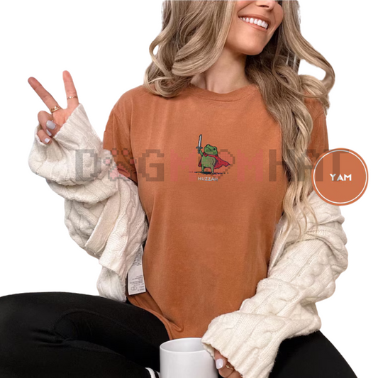 Huzzah Frog with Sword Tee – Embroidered Medieval Frog Shirt