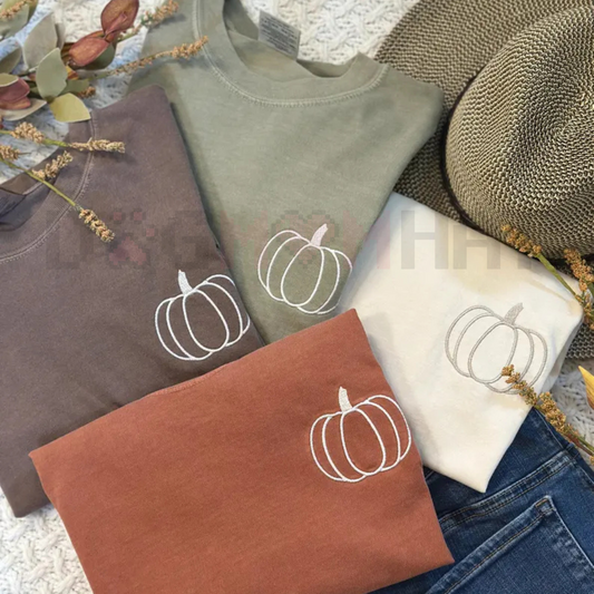 Pumpkin Outline Embroidered Comfort Colors Tee – Simple Minimal Fall Crewneck T-Shirt