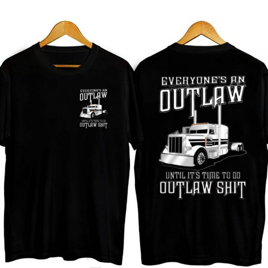 Outlaw Semi Truck T-Shirt – Black Tee with Peterbilt Big Rig Graphic, "Everyone’s an Outlaw..." Quote, Trucker Lifestyle Shirt