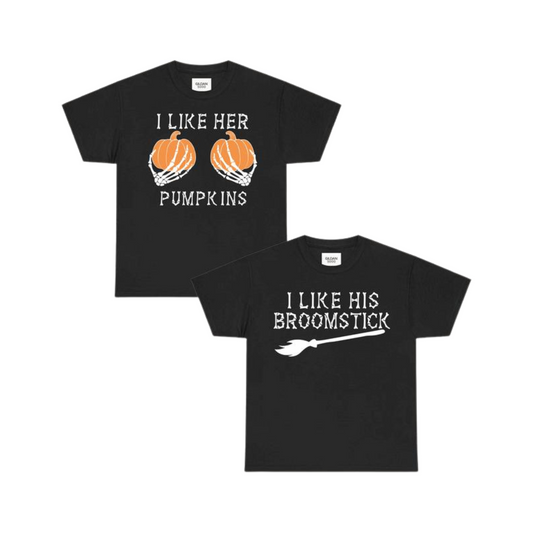 "I Like Her Pumpkins / I Like His Broomstick" Funny Halloween Couple Shirts