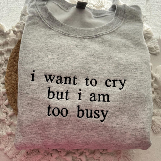 I Want to Cry but I am too Busy Sweatshirt - Funny Quote Embroidered Hoodie, Gift for Her and Him