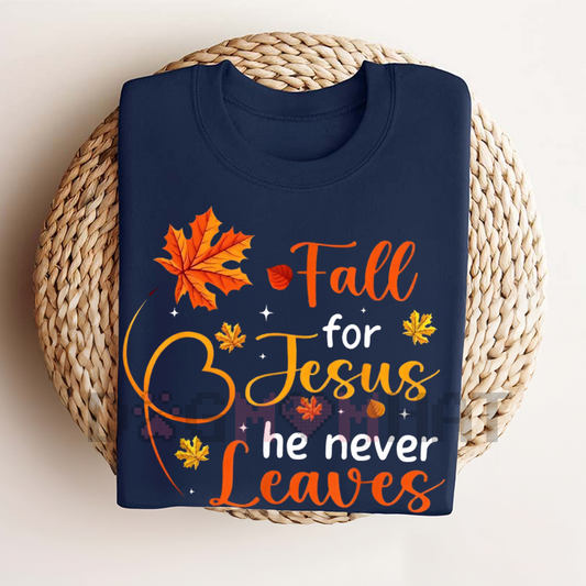 Fall For Jesus He Never Leaves T-Shirt – Autumn Christian Women's Tee
