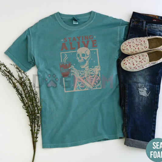 "Staying Alive" Coffee T-Shirt – Funny Skeleton Tee, Trendy Retro Halloween, Women's Comfort Colors Shirt