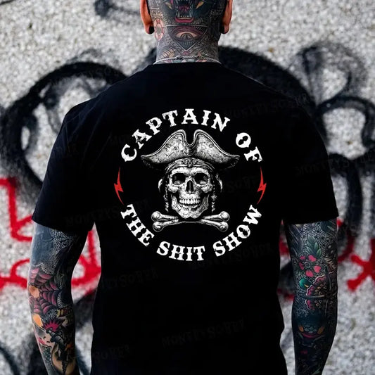 "Captain of the Shit Show" Skull Print T-Shirt – Funny & Fashionable Men's Crewneck, Casual Cotton Tee