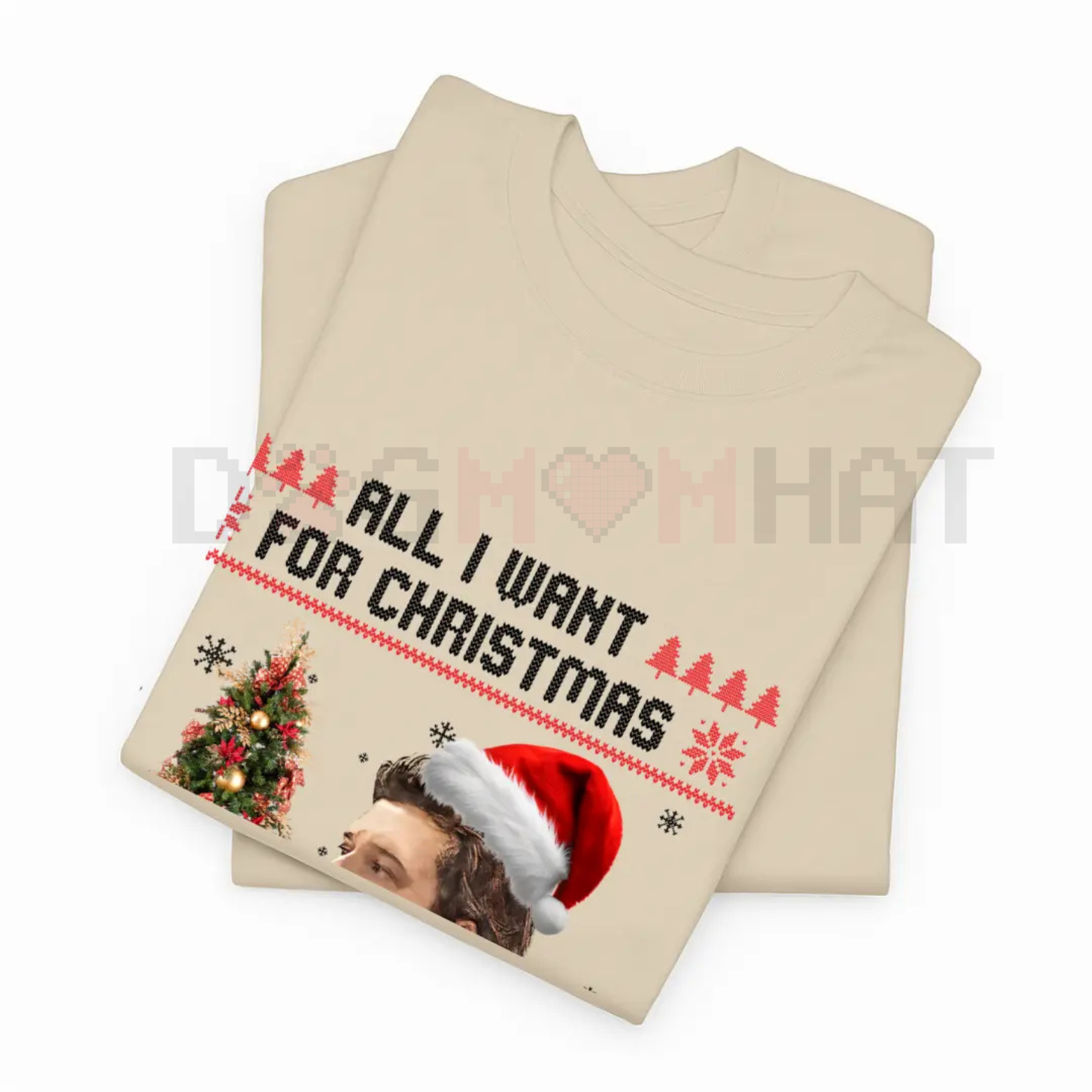 The shirt features the iconic, humorous slogan, "All I Want for Christmas" (often completed with a witty, music-related punchline or a graphic of a microphone/music note). This Funny Holiday Slogan Tee instantly connects you with fellow Christmas Music Lover fans and makes for a fantastic Christmas Party Shirt.