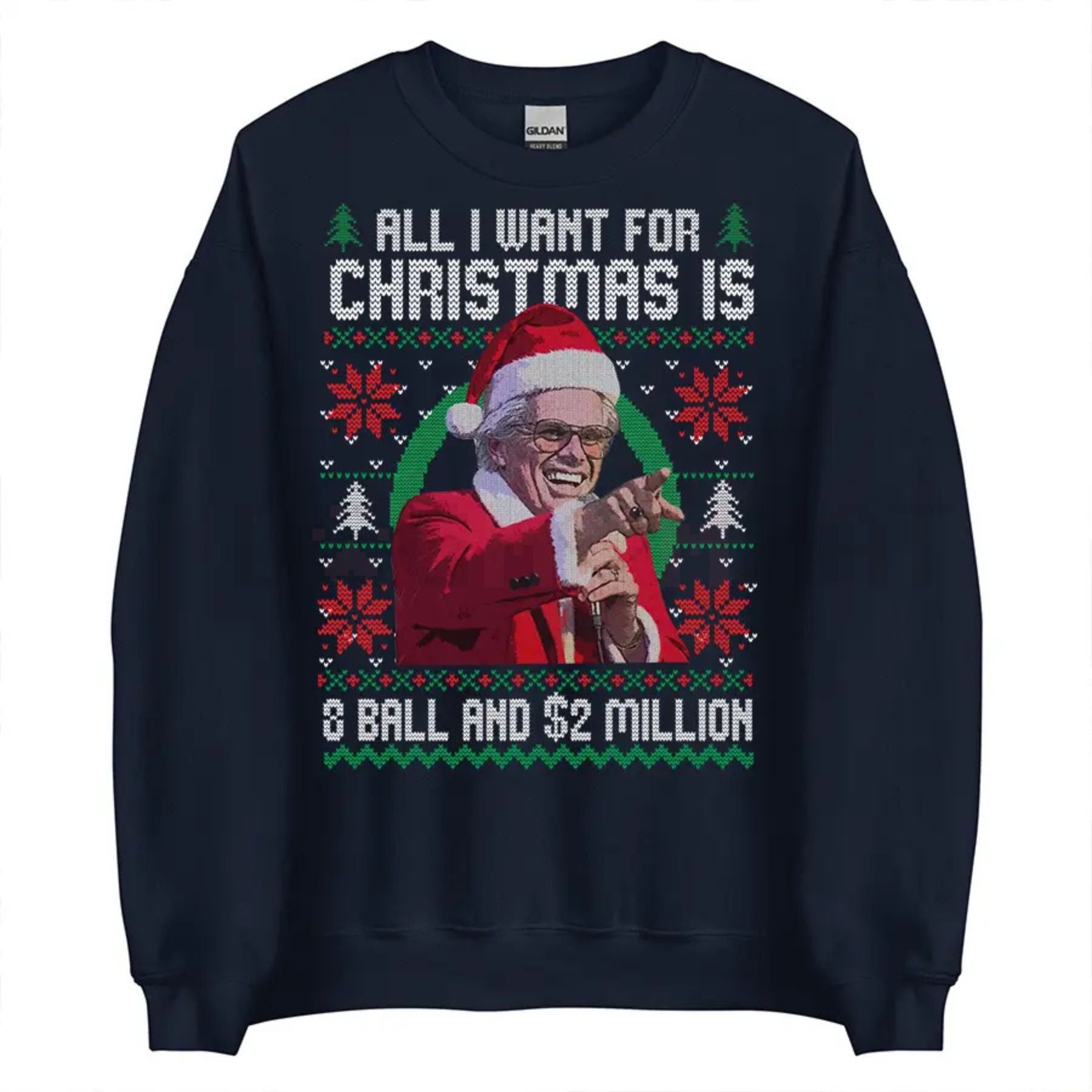 🎤💰 A True Man of God Knows What He Wants for Christmas. Celebrate the season with the signature sleaze and hilarity of everyone's favorite uncle with the Baby Billy '8-Ball And 2 Million' Ugly Christmas Sweatshirt! This brilliant piece features the unforgettable quote, "All I Want For Christmas Is A 8-Ball And 2 Million," perfectly capturing Uncle Baby Billy Freeman's unique interpretation of the Christmas spirit.