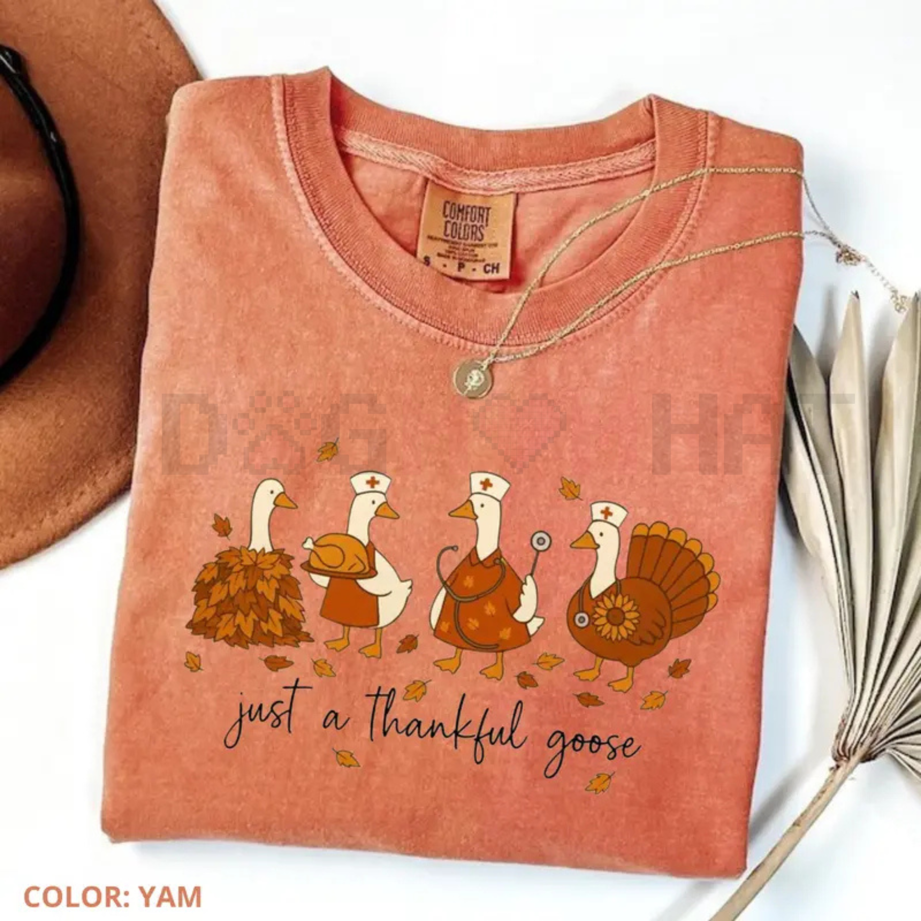 👩⚕️🍂 Feathers, Gratitude, and Patient Care. Honk If You Love Nurses! Bring a smile to the hospital halls and celebrate the season of gratitude with the Comfort Colors® 'Just A Thankful Goose' Nurse T-Shirt! This charming and hilarious tee features a playful goose graphic combined with a thankful sentiment, making it the perfect Funny Fall Nurse Tee and a cozy way to celebrate Thanksgiving.