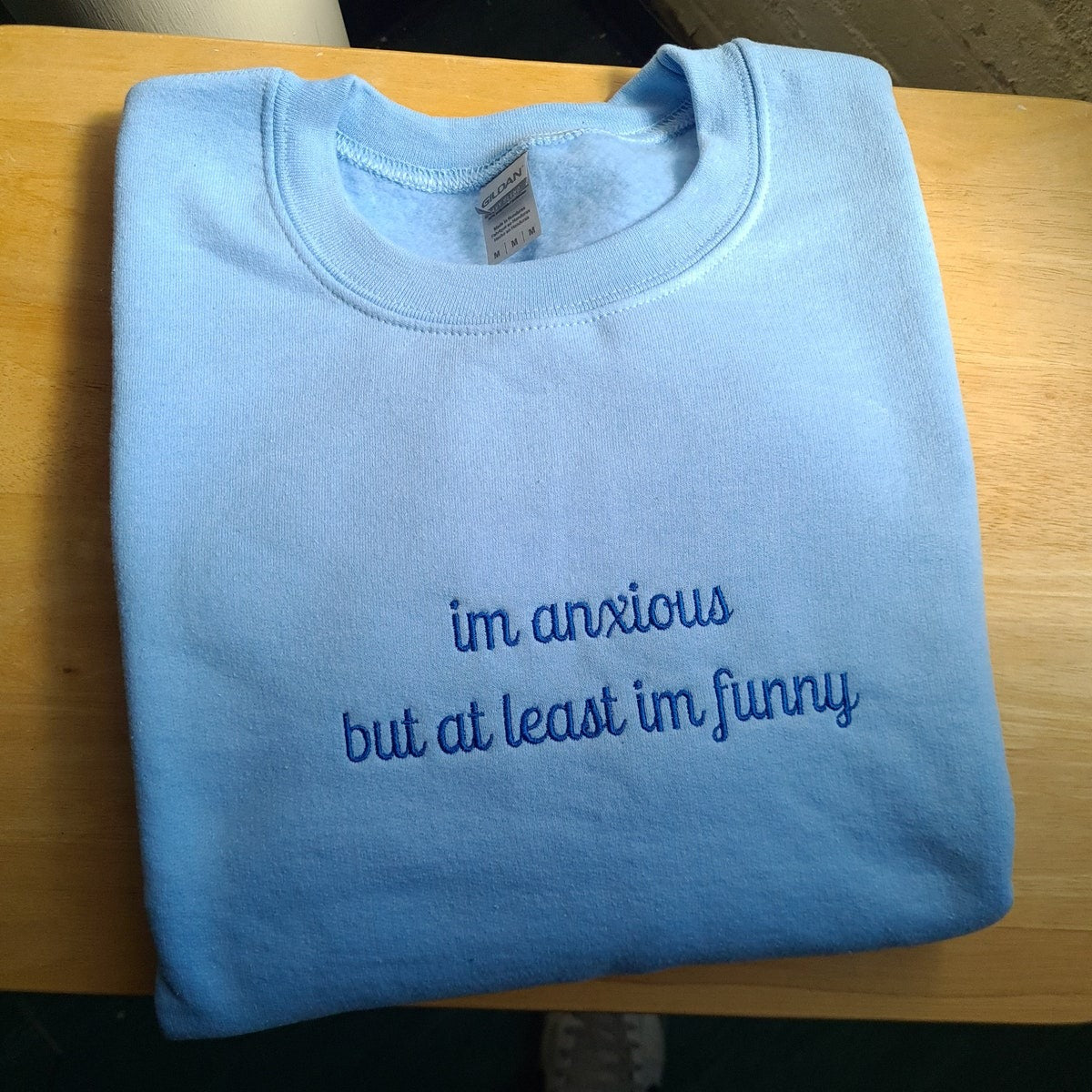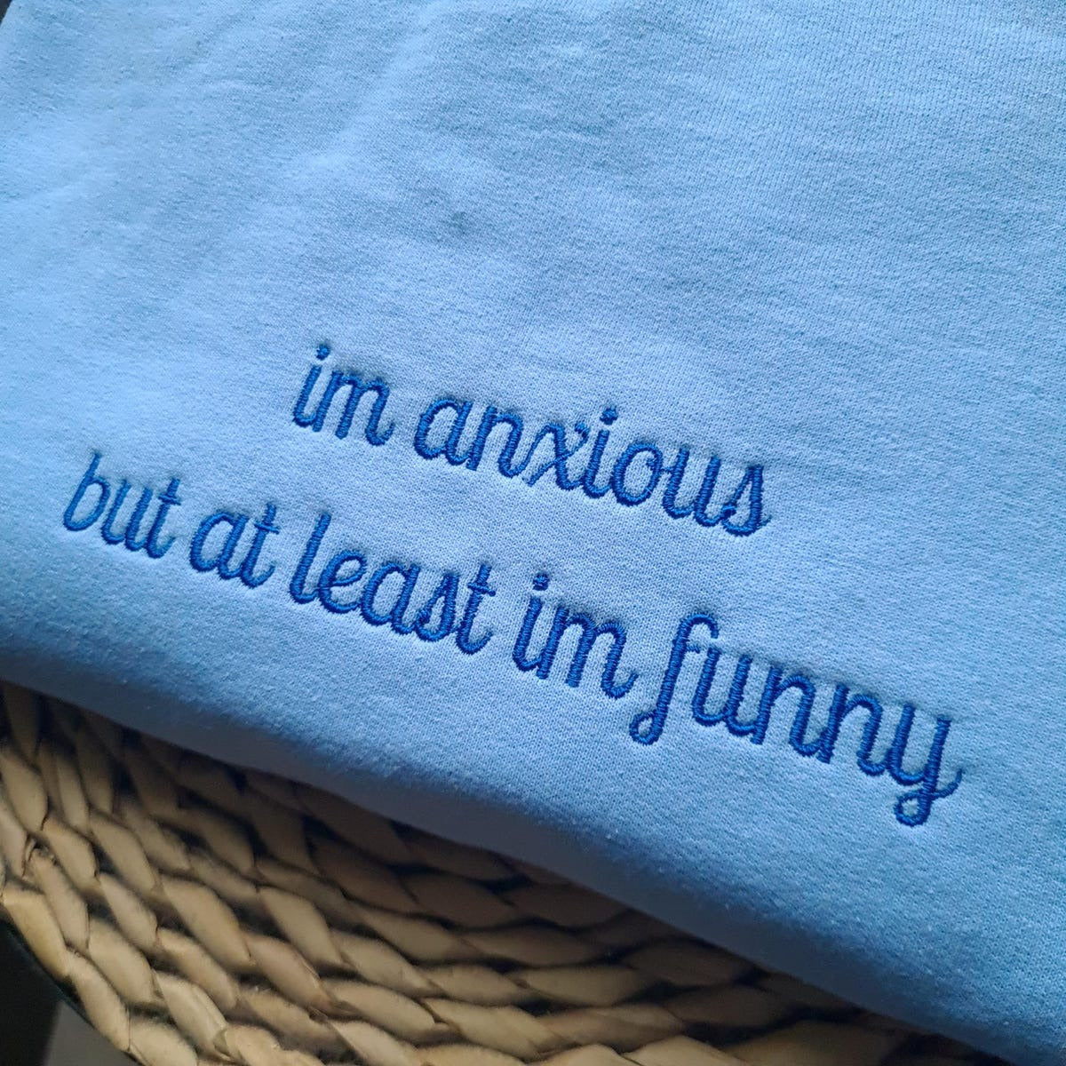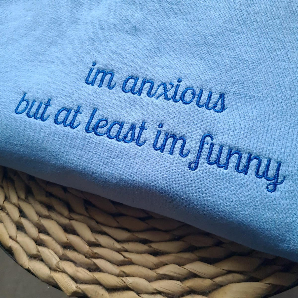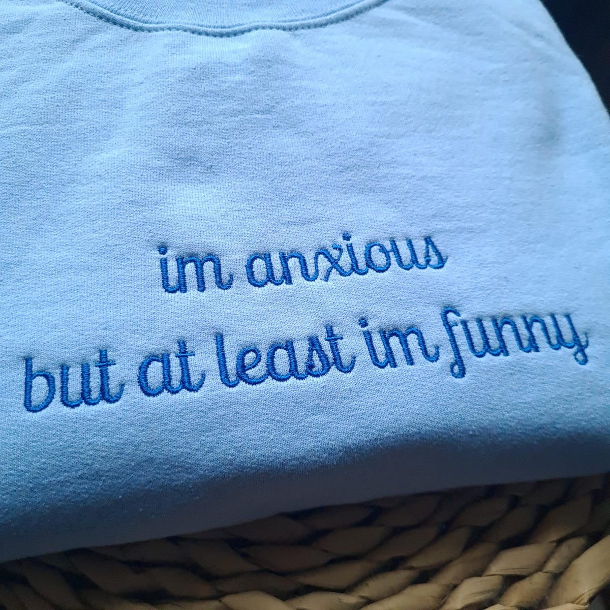Custom Embroidered I'm Anxious But at Least I'm Funny Sweatshirt - Funny Clothing, Gifts for Her, Mental Health Hoodie