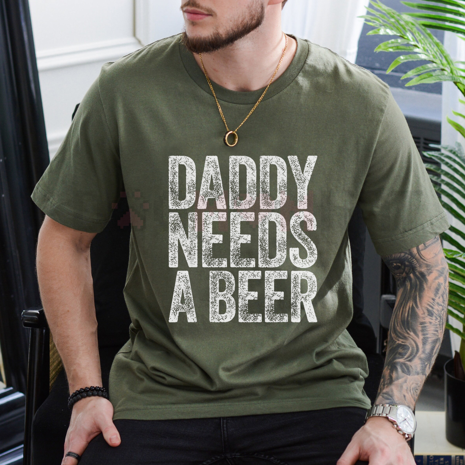 The shirt features the bold, relatable slogan: "Daddy Needs A Beer" (often paired with a humorous graphic like a cold glass, a weary expression, or a funny icon). It's an instant conversation starter and a visual plea for that perfect, icy beverage.