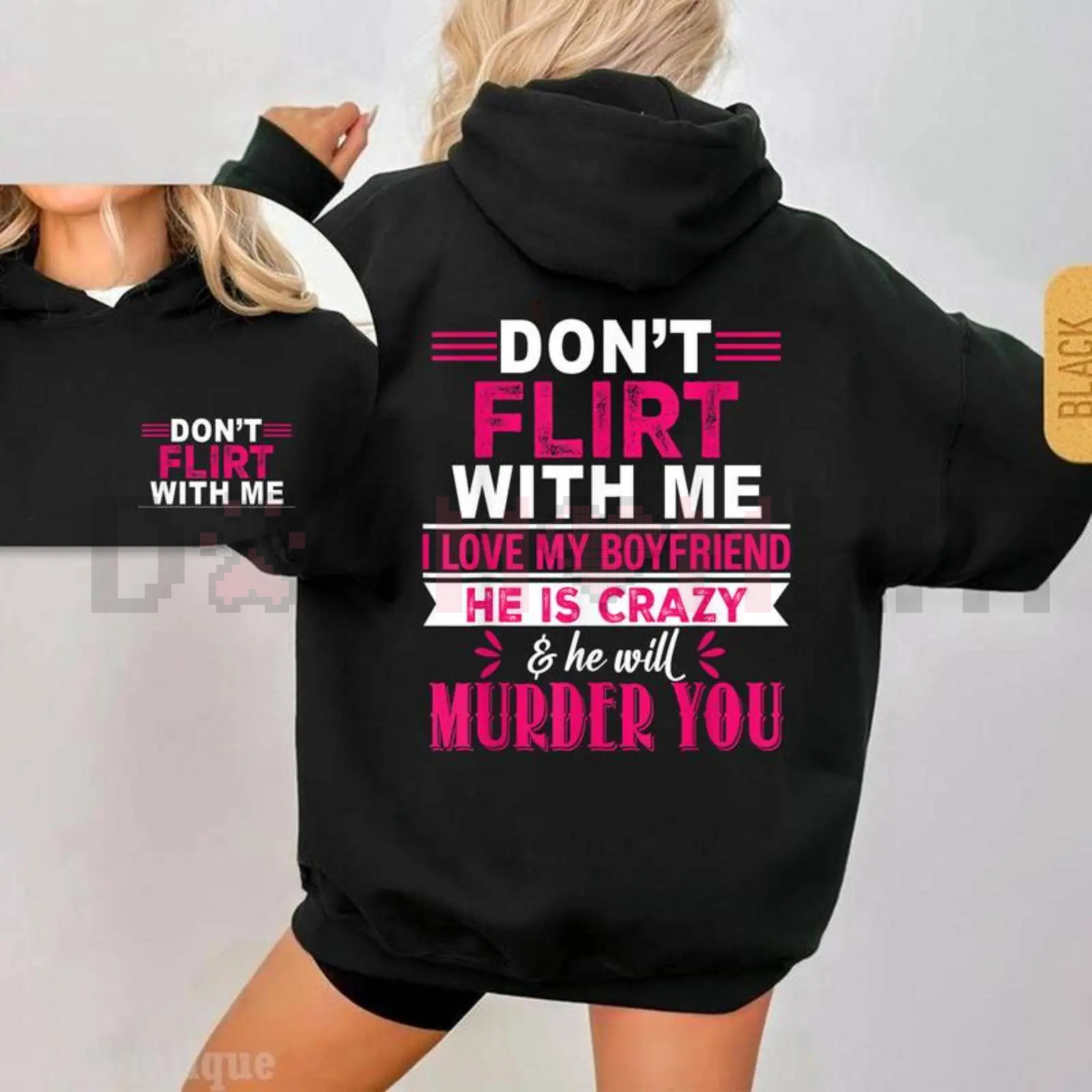 🤣 Funny Slogan Pullover Features the direct and hilarious relationship statement: "Don't Flirt With Me I Love My Crazy Boyfriend."