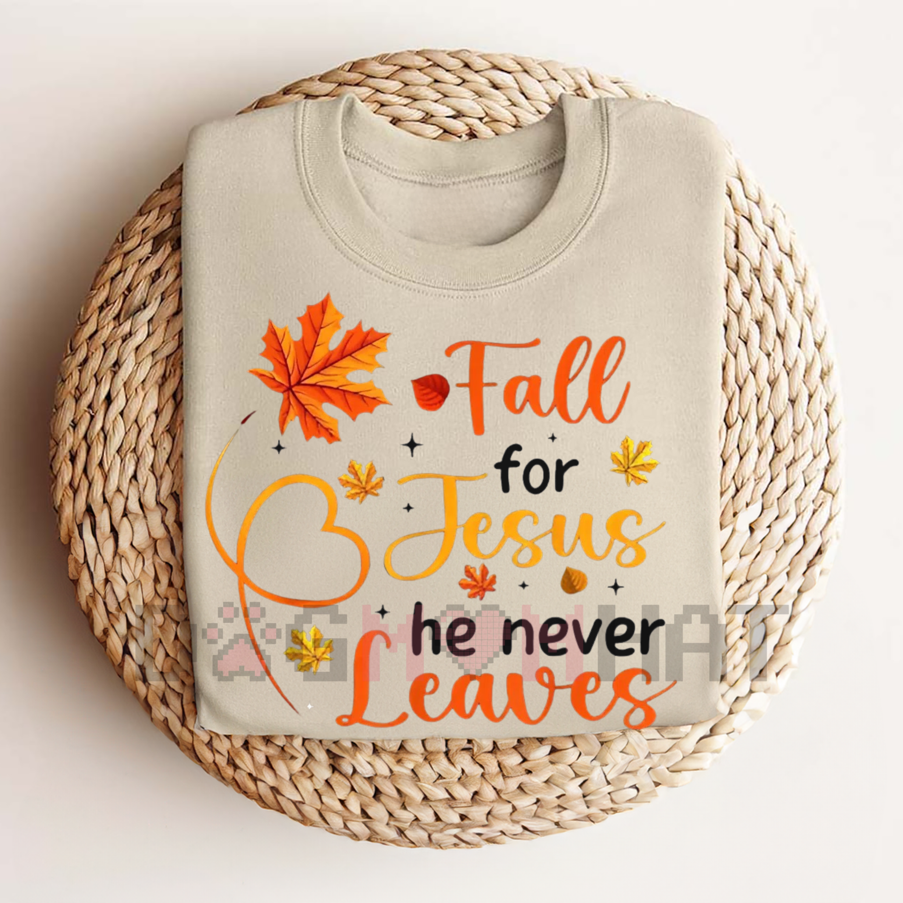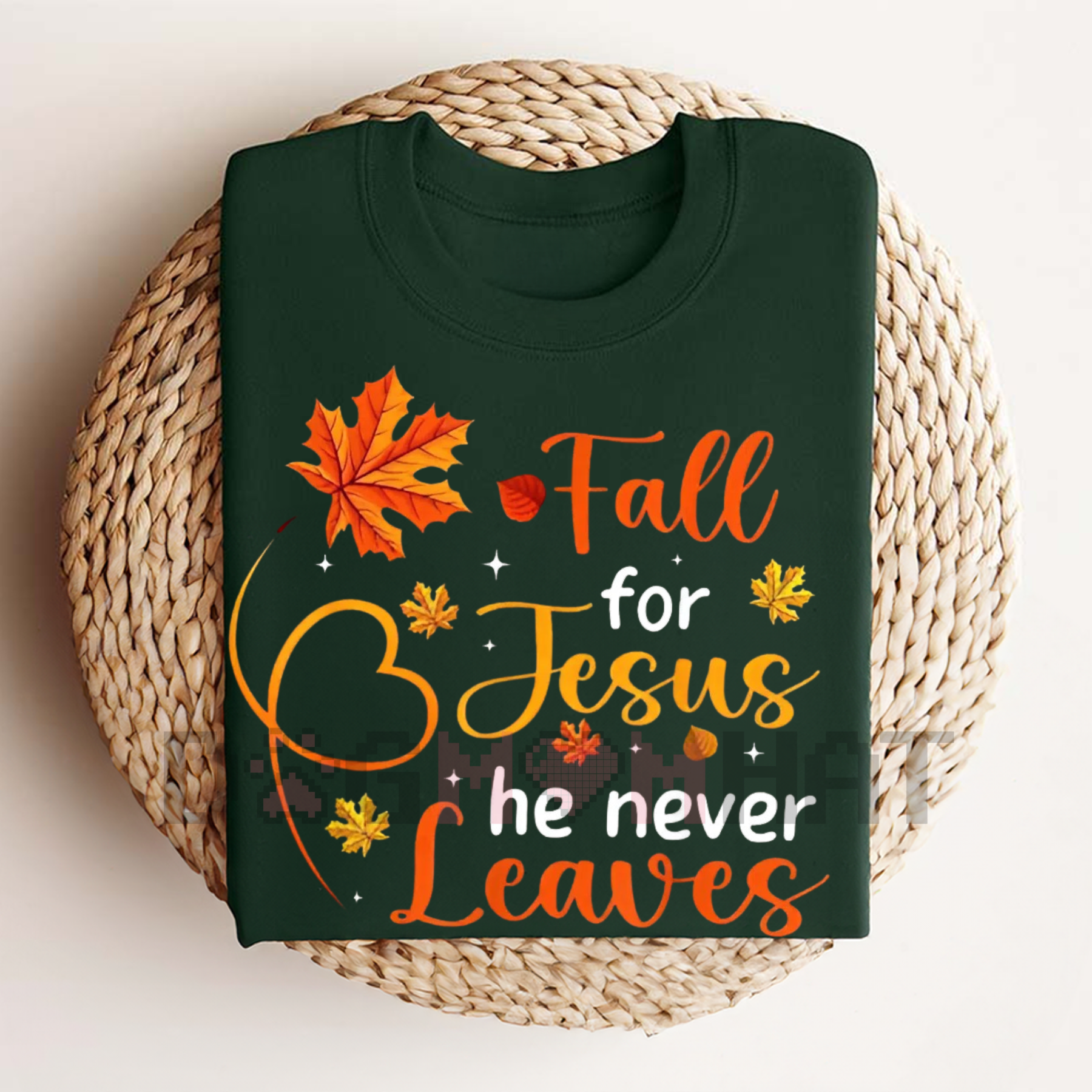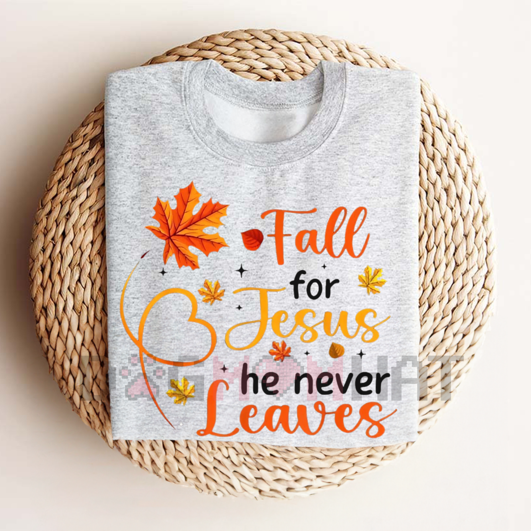 Fall For Jesus He Never Leaves T-Shirt – Autumn Christian Women's Tee