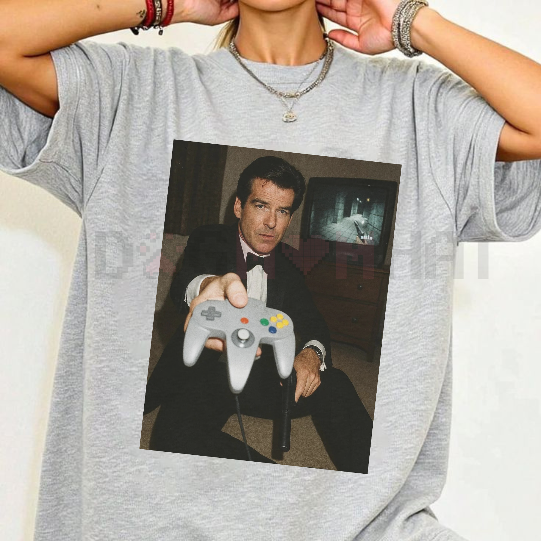 🕹️🕵️ The Name is Bond. James Bond. And We're Playing on the N64. Relive the glory days of console shooters and split-screen multiplayer with the GoldenEye 007 N64 T-Shirt! This iconic tee pays homage to the definitive Nintendo 64 Classic, a true Gaming Legend that revolutionized the 90s FPS genre.
