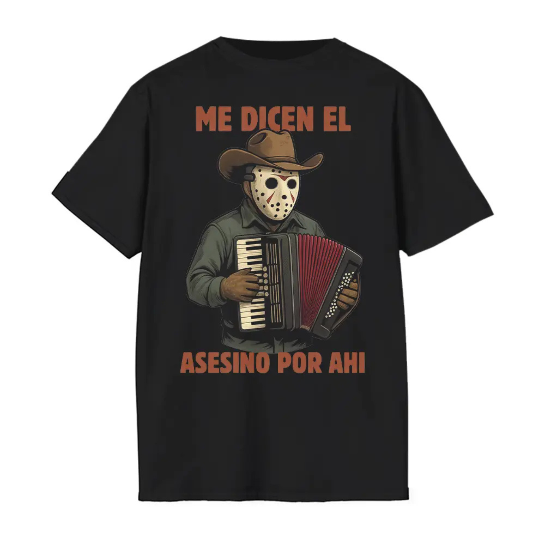Me Dicen El Asesino Por Ahi Shirt – Horror Movie Villains, Accordion Tee, Jason, Freddy, Ghostface, Michael Myers