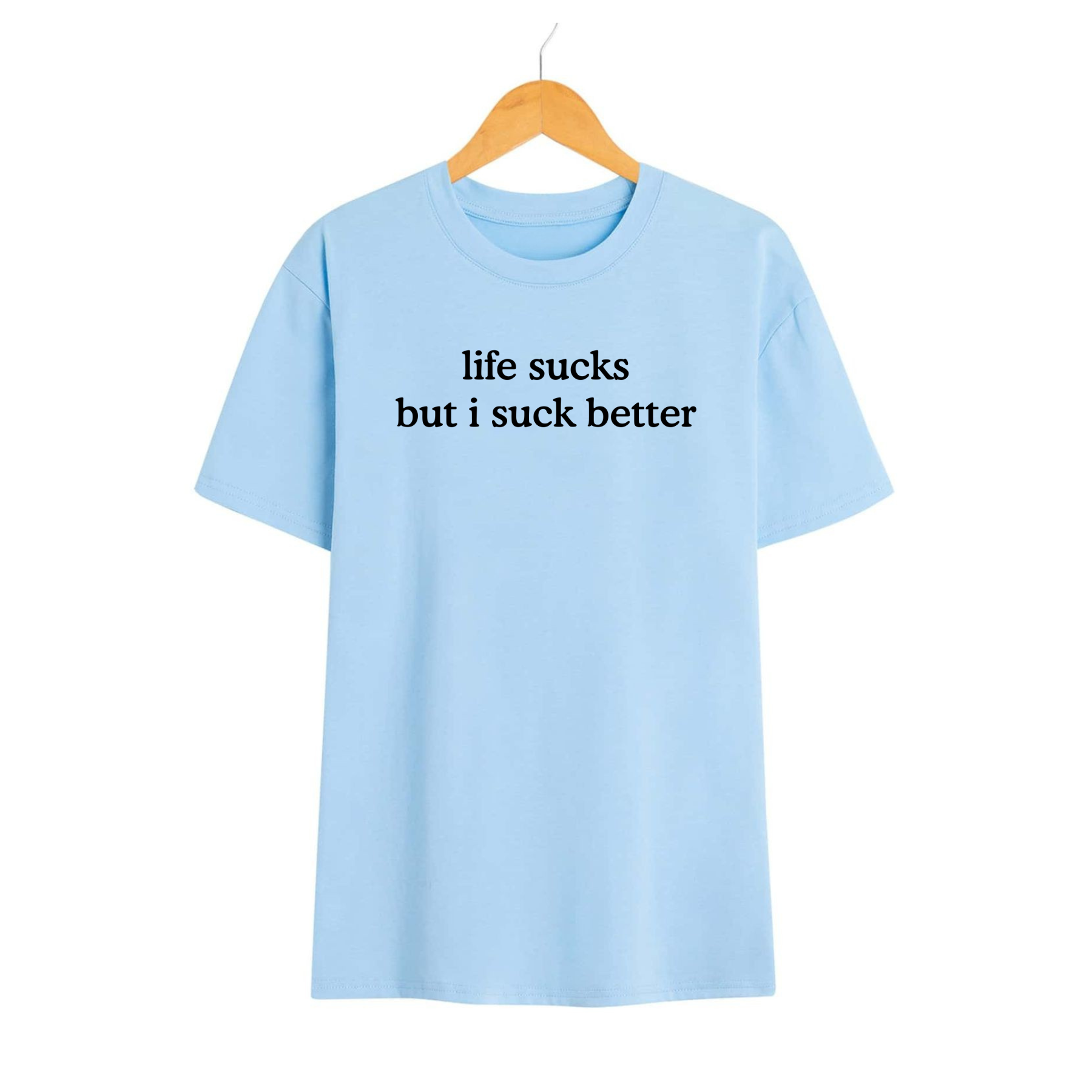 Funny Sarcastic Slogan: Features the bold and humorous "Life Sucks But I Suck Better" message.