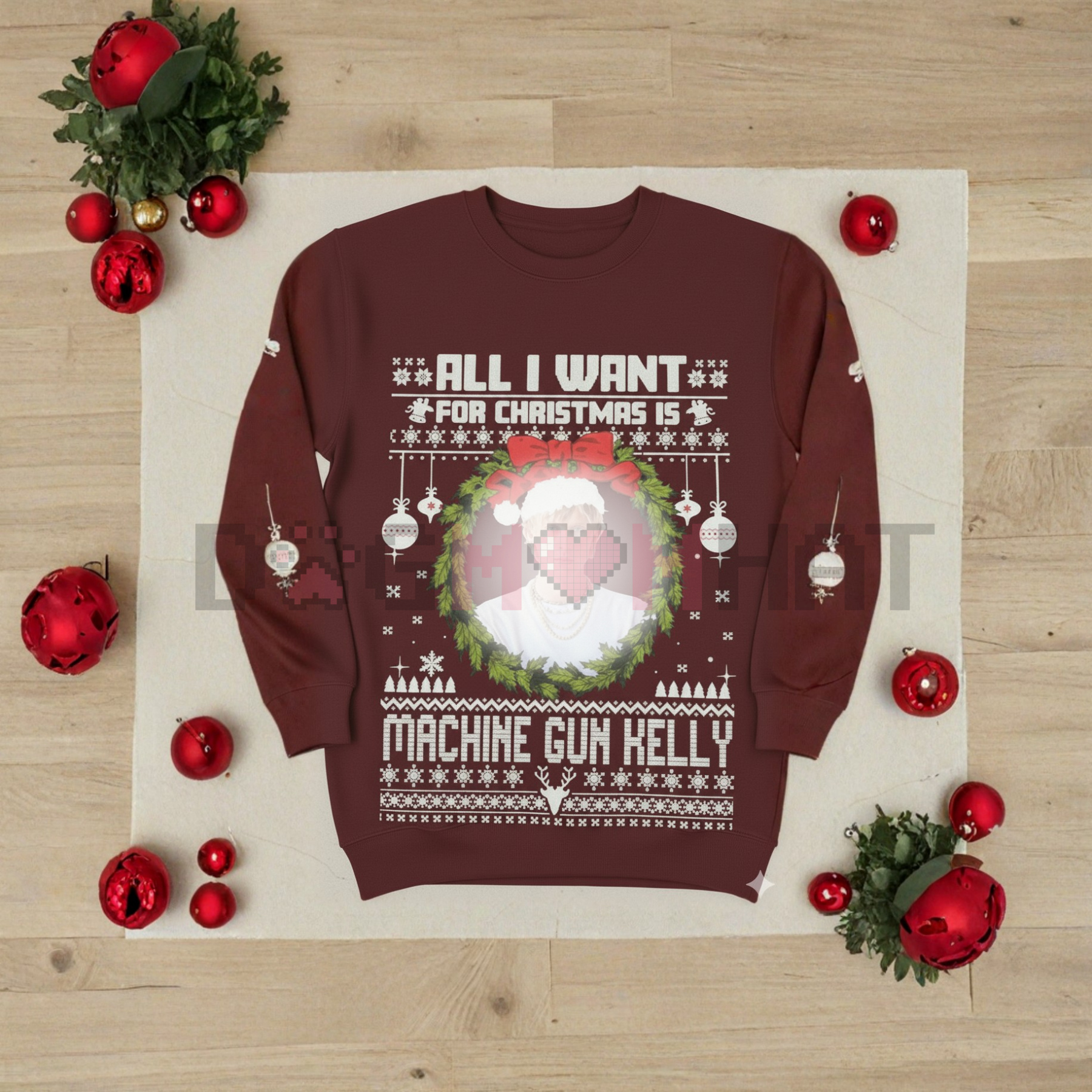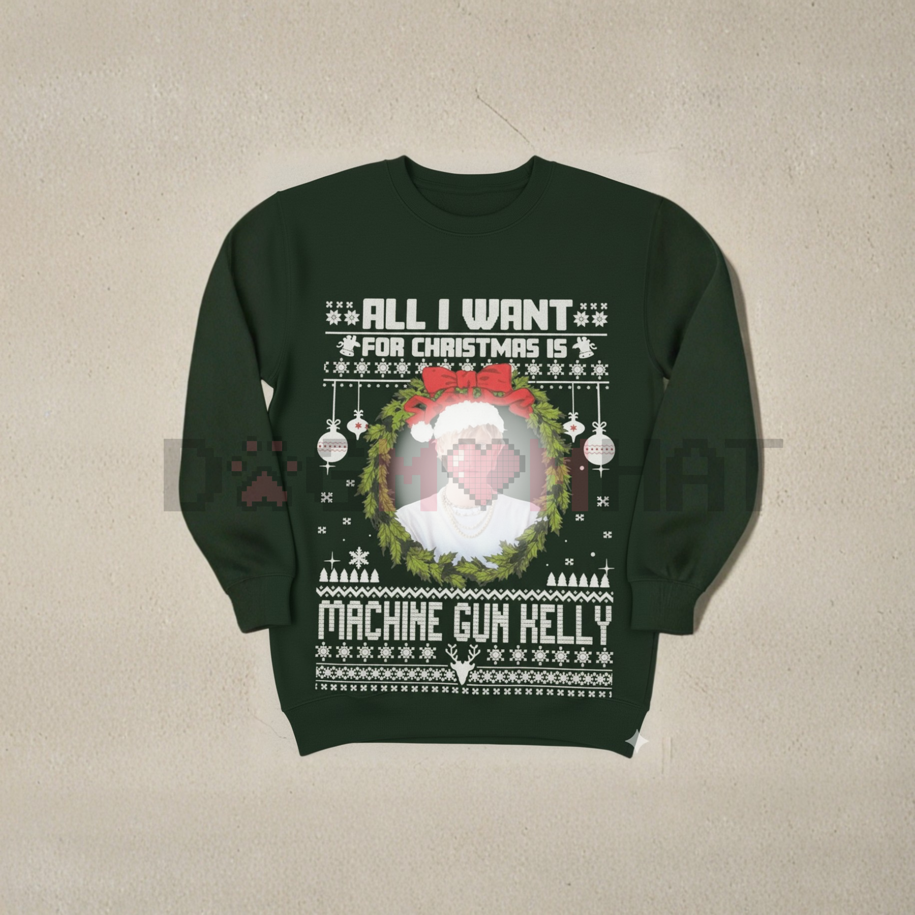 The design likely features MGK's stylized name, initials, or iconic imagery intertwined with holiday elements like snowflakes, candy canes, or a Santa hat, making it a hilarious and original twist on a Christmas favorite. It's the perfect Unisex top for: