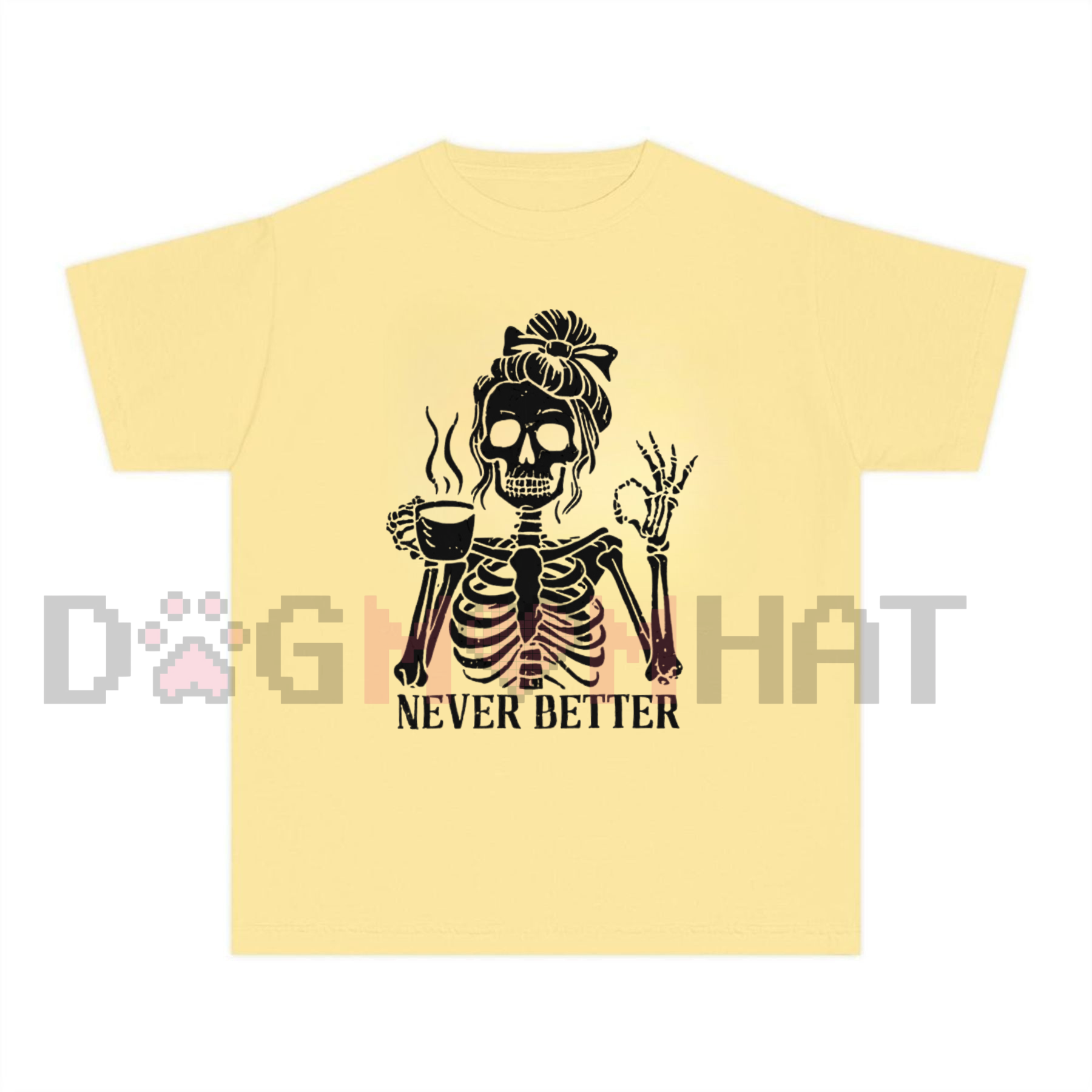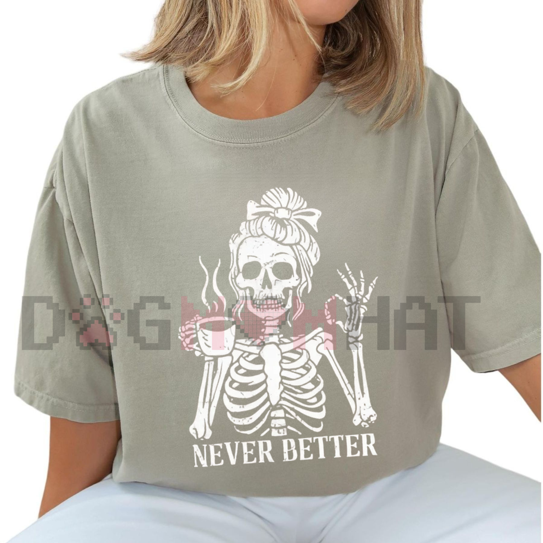 'Never Better' Skeleton Shirt – Halloween Humor Coffee Lover T-shirt, Spooky Fall Essential, Goth Aesthetic Tee
