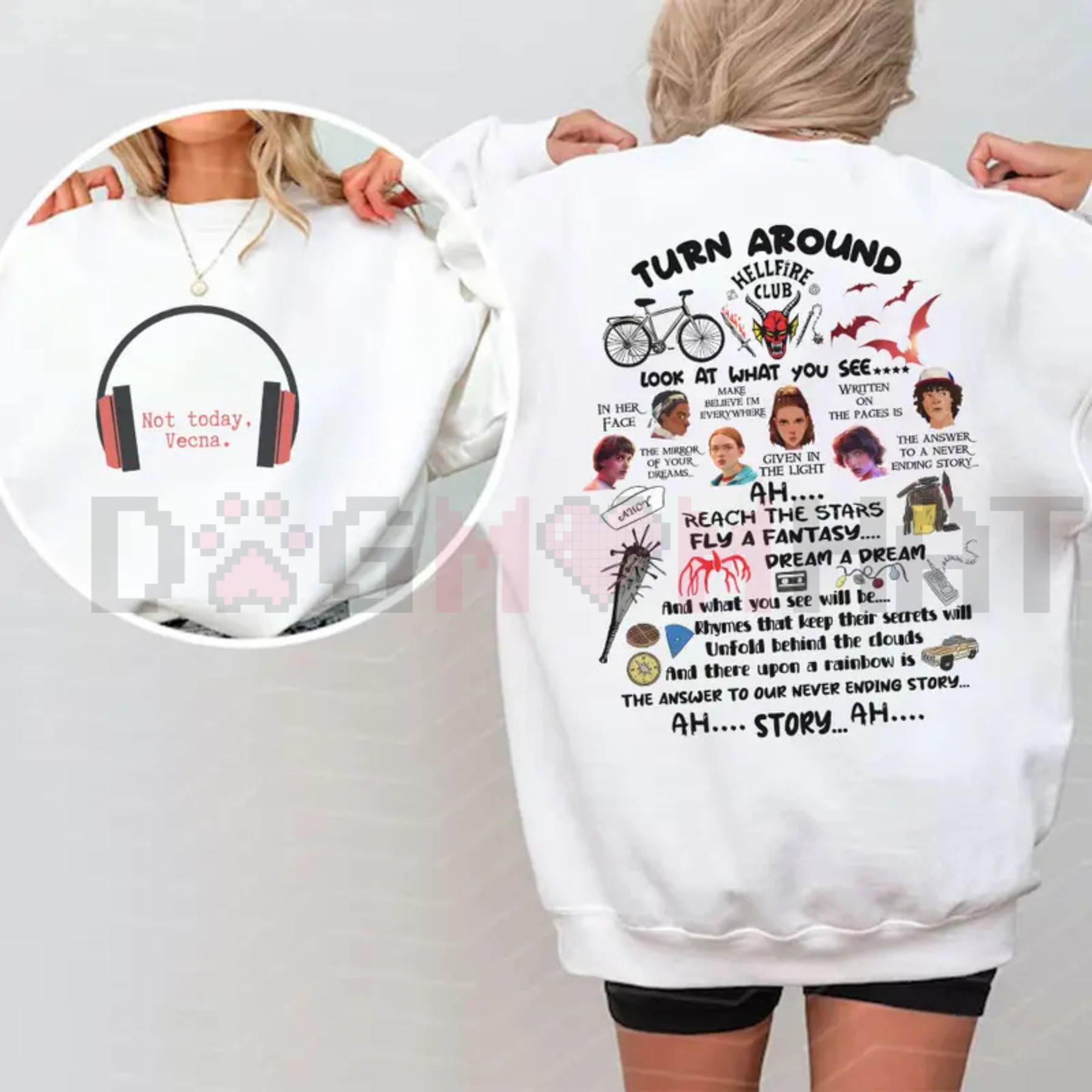 The "Not Today Vecna" Funny Sweatshirt is the perfect blend of Stranger Things suspense, 80s nostalgia, and holiday cheer! Featuring a clever slogan and a design inspired by the iconic "Never Ending Story" scene, this Retro Graphic Crewneck is a must-have for fans. The unique 2 sides print ensures the tribute is visible from every angle.