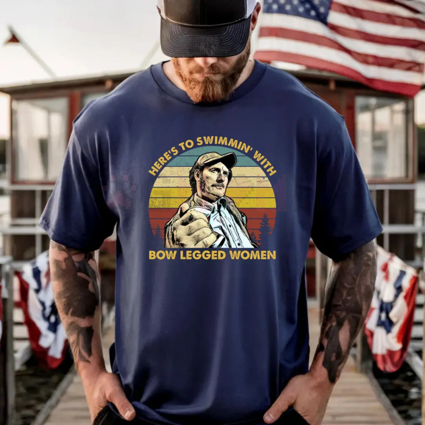 The shirt features the notorious, hilarious line from Quint's famous U.S.S. Indianapolis speech: "Here's to swimmin' with bow-legged women!" This Humorous Apparel captures the raw, Nautical Slogan style of a true fisherman and makes for an instant conversation starter among film buffs.