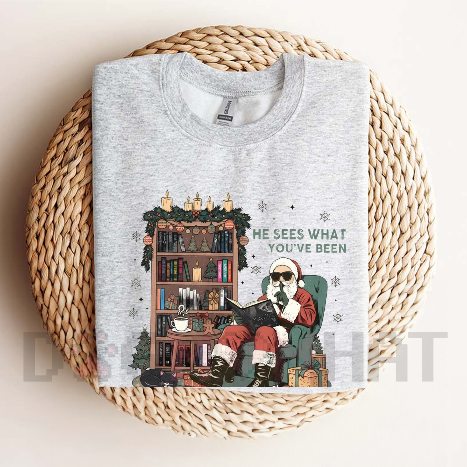 Funny Holiday Twist: Features the slogan "He Sees What You've Been Reading," combined with a hilarious Santa graphic.