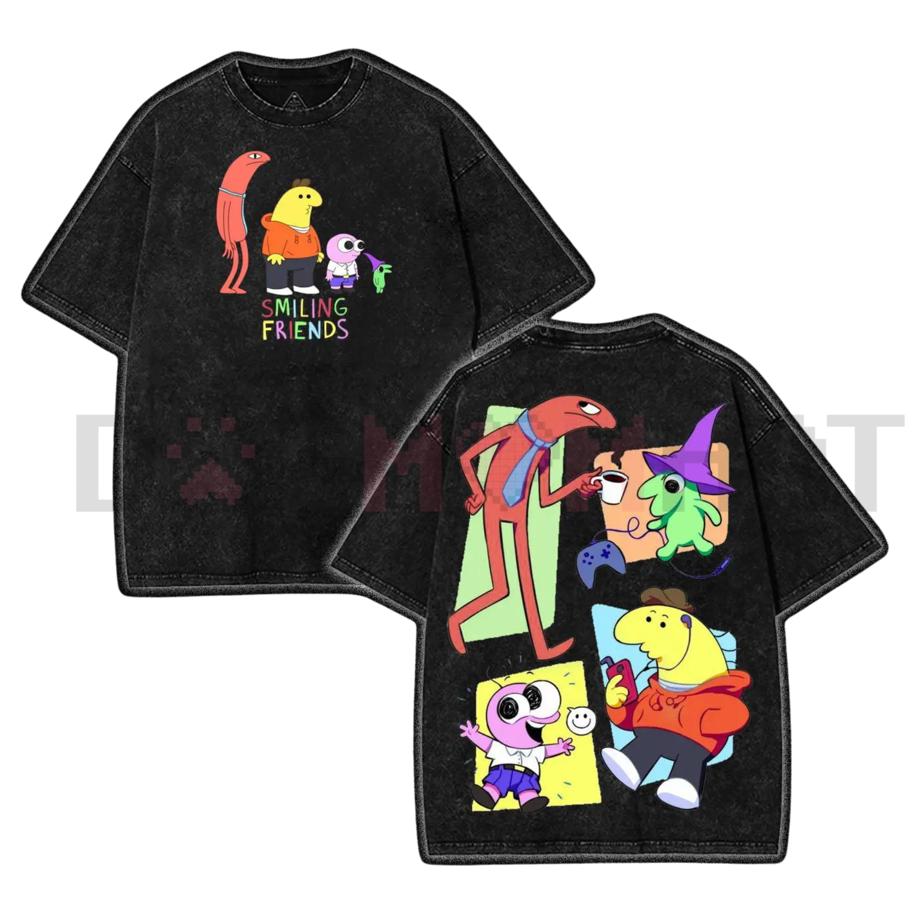 This isn't your standard brightly-colored cartoon merch. We’ve given this piece a heavy stone-wash treatment, creating a faded, vintage charcoal aesthetic that looks like a rare find from a 90s thrift shop. With double-sided printing, you’re repping the "Smiling Friends" HQ from every angle.