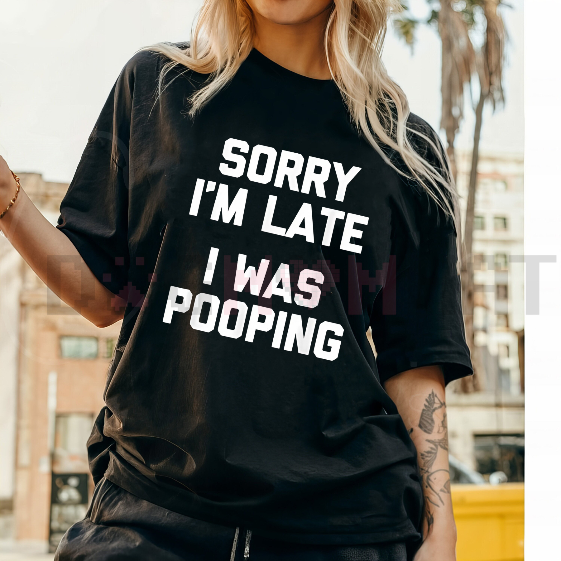 Blunt Humor Slogan: Features the hilariously honest and shocking statement: "Sorry I'm Late, I Was Pooping."